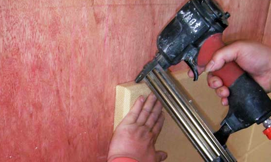 貼幾個點,將板平貼在石膏板上,用打釘器將釘固定在吸音板開榫處,吸聲板之間用插